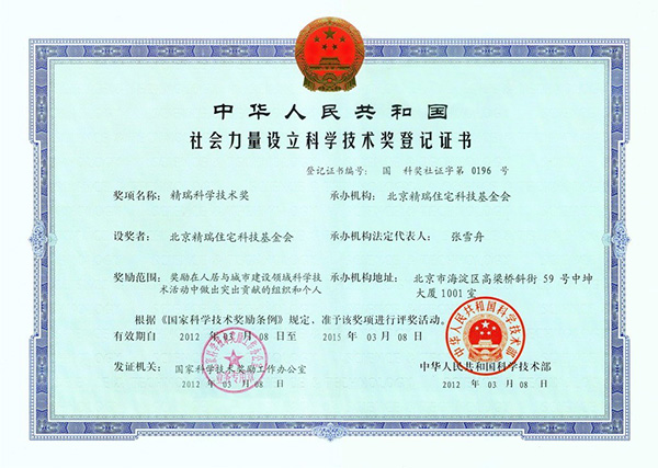 精瑞科學(xué)技術(shù)獎(jiǎng)簡(jiǎn)稱“精瑞獎(jiǎng)”,是經(jīng)國(guó)家科技部、國(guó)家科學(xué)技術(shù)獎(jiǎng)勵(lì)工作辦公室批準(zhǔn),由精瑞科技基金會(huì)設(shè)立,是國(guó)家社會(huì)力量設(shè)立科學(xué)技術(shù)獎(jiǎng)的重要組成部分,在全國(guó)工商聯(lián)房地產(chǎn)商會(huì)指導(dǎo)下,開展人居與城市建設(shè)領(lǐng)域的獎(jiǎng)勵(lì)工作!熬皙(jiǎng)”每年評(píng)選一次,現(xiàn)已成功舉辦12屆,成為中國(guó)人居與城市建設(shè)領(lǐng)域最具權(quán)威性、專業(yè)性與示范性的獎(jiǎng)項(xiàng)。是目前唯一被批準(zhǔn)在中國(guó)人居領(lǐng)域進(jìn)行表彰與獎(jiǎng)勵(lì)工作的國(guó)家級(jí)科技獎(jiǎng)項(xiàng)。