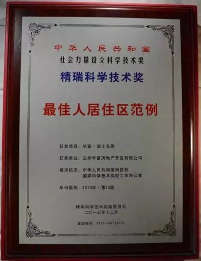 2015年12月22日,第十二屆精瑞科學(xué)技術(shù)獎(jiǎng)在廣州揭曉,經(jīng)評(píng)審委員會(huì)的初審、集中復(fù)評(píng),華富集團(tuán)傾力打造的華富·瑞士名居項(xiàng)目獲得2015中國(guó)地產(chǎn)蘭州地區(qū)唯一“最佳人居住區(qū)范例獎(jiǎng)”。