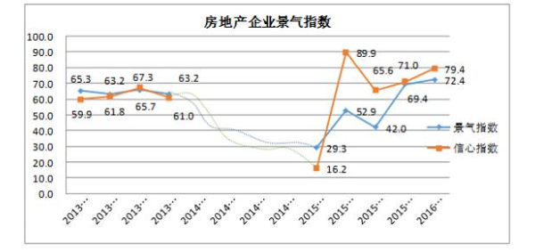 報(bào)告顯示,由于金融和房地產(chǎn)利好政策持續(xù)釋放,2016年一季度,房地產(chǎn)企業(yè)景氣指數(shù)繼2015年第四季度連續(xù)兩個(gè)季度回升到50景氣線之上達(dá)到72.4,比2015年第四季度上升了3個(gè)百分點(diǎn),企業(yè)家信心指數(shù)為79.4,同2015年四季度上升了8.4個(gè)百分點(diǎn)。土地購(gòu)置面積和預(yù)期增加,商品房銷售面積和銷售價(jià)格持續(xù)上升,待售面積繼續(xù)減少,企業(yè)經(jīng)營(yíng)情況繼續(xù)好轉(zhuǎn),投資意愿較為平穩(wěn),土地購(gòu)置價(jià)格穩(wěn)中有升,企業(yè)融資困難程度有所緩解,但地區(qū)分化情況加大值得關(guān)注。