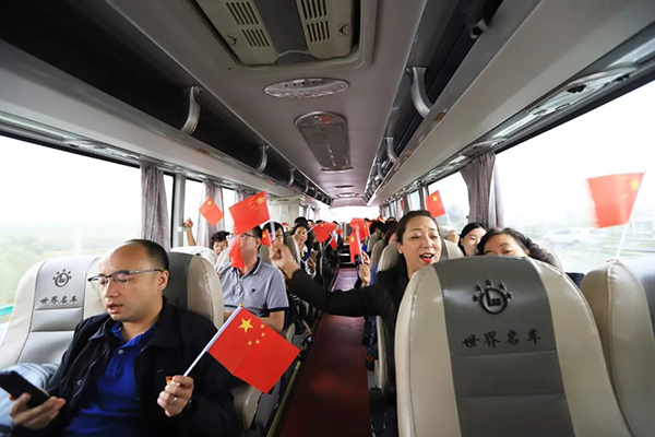 早晨下著大雨,但依然不減華富集團各公司成員的熱情,在去往會寧的路上,一路高唱《我和我的祖國》、《我愛你,中國》、《我的祖國》一系列感動人心的紅歌。另外各公司還表演了激昂磅礴的詩朗誦。紅歌嘹亮,大家共同慶祝中華人民共和國成立70周年,共同唱響對祖國的尊崇熱愛。